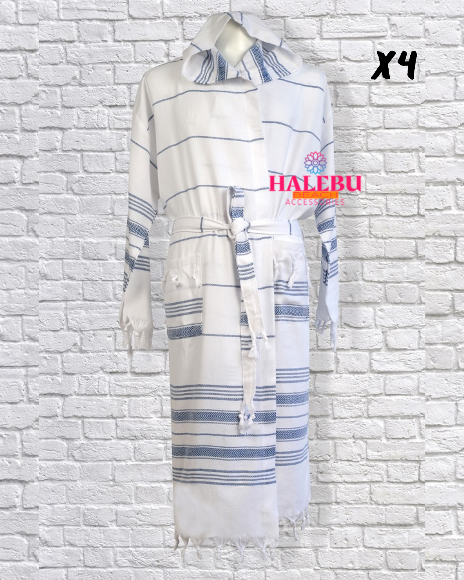 4 Pieces Blue White Striped Hooded Peshtemal Bathrobe